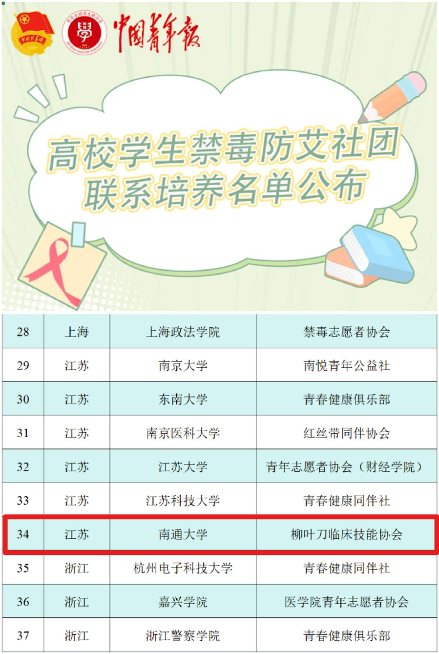 近日,由共青团中央维护青少年权益部、中华全国学联秘书处、中国青年报社开展的高校学生禁毒防艾社团征集活动结果公布,我校柳叶刀临床技能协会成功入围全国百团名单。